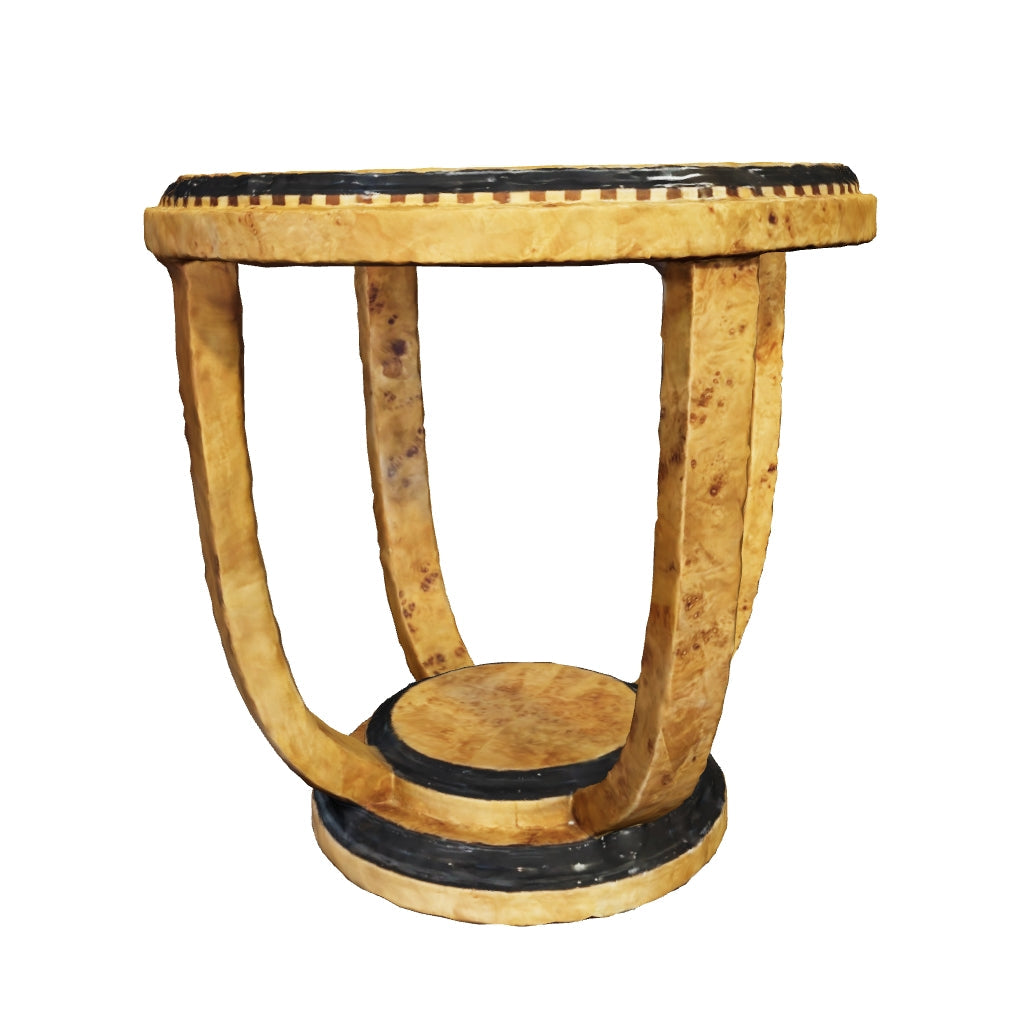 Het ronde tafelblad is uitgevoerd in rijk wortelnotenhout fineer, dat wordt gekenmerkt door zijn levendige tekening en warme gloed. De subtiele vernislaag verdiept de kleur en beschermt het oppervlak, waardoor het hout zijn natuurlijke glans behoudt. Langs de rand loopt een ingelegd motief in zwart lak, dat het design extra dimensie geeft en een subtiele verwijzing vormt naar de grafische lijnen van Art Deco-interieurs.